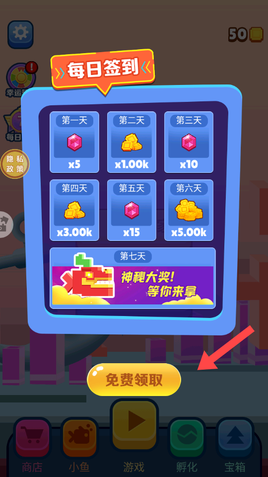 2、在【每日签到】界面,点击【免费领取】按钮,获取每日奖励,积累游戏资源。