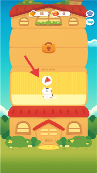 2、在游戏场景中按箭头指向关注猫咪所在楼层,可能需进行与该楼层相关操作。