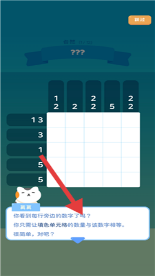 3、在数涂玩法教学界面,按箭头指向阅读提示信息,了解需使填色单元格数量与每行旁边数字相等的规则,开始游戏。
