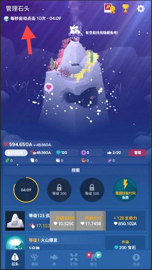 1、在【管理石头】界面,利用【每秒自动点击10次】功能积累基础资源,关注倒计时与产出数值,为后续发展奠基。