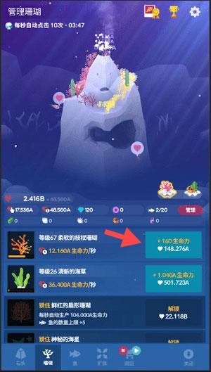2、进入【管理珊瑚】界面,升级如【柔软的枝状珊瑚】【清新的海草】等珊瑚,提升【生命力/秒】属性,增强整体生命力产出。