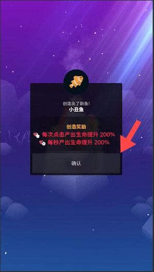 3、当创造出小鱼(如【小丑鱼】)并出现奖励提示时,及时点击【确认】,获取【每次点击产出生命提升200%】【每秒产出生命提升200%】的增益,快速提升游戏进度。