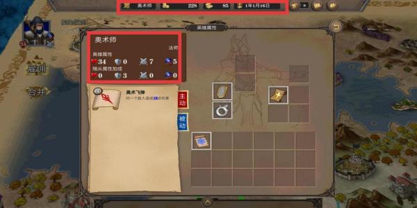 1、关注顶部资源条(如金币、木材等),查看英雄属性(如【奥术师】等级34、攻击7),合理分配资源培养英雄。