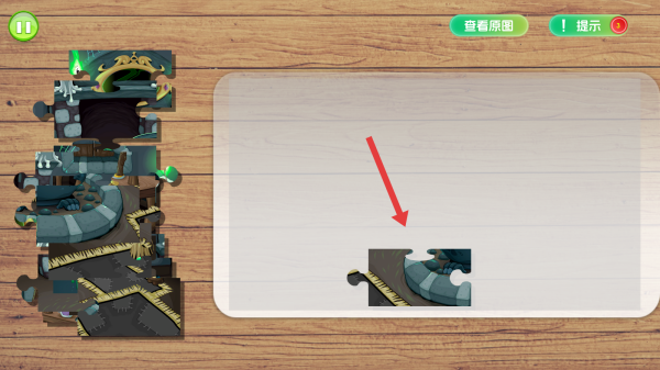 2、在拼图游戏界面,按箭头指向将左侧的拼图块拖动到右侧空白区域合适位置。