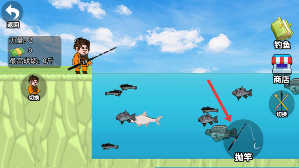 2、在游戏进行中,按箭头指向点击【抛竿】按钮,将鱼竿抛出进行钓鱼操作。
