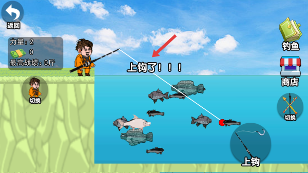 3、当出现“上钩了!!!”提示时,按箭头指向进行相应操作(可能是收竿等),成功钓到鱼,推进游戏进程。