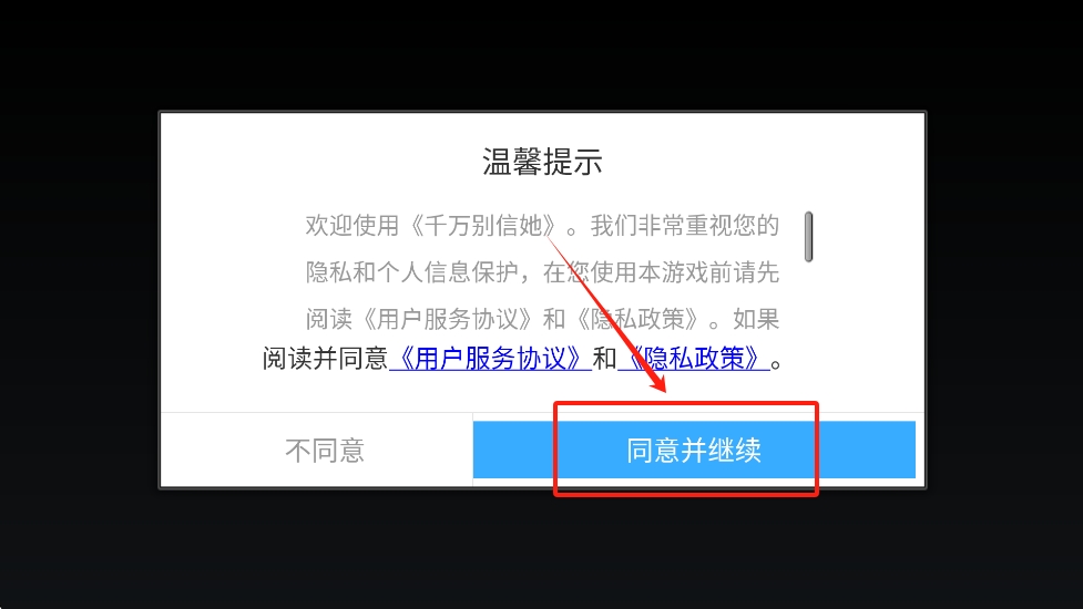 1、首先,阅读并同意《用户服务协议》和《隐私政策》,点击“同意并继续”以进入游戏。