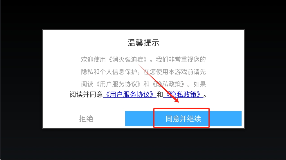 1、首先,阅读并同意游戏的温馨提示,点击“同意并继续”以接受用户服务协议和隐私政策。