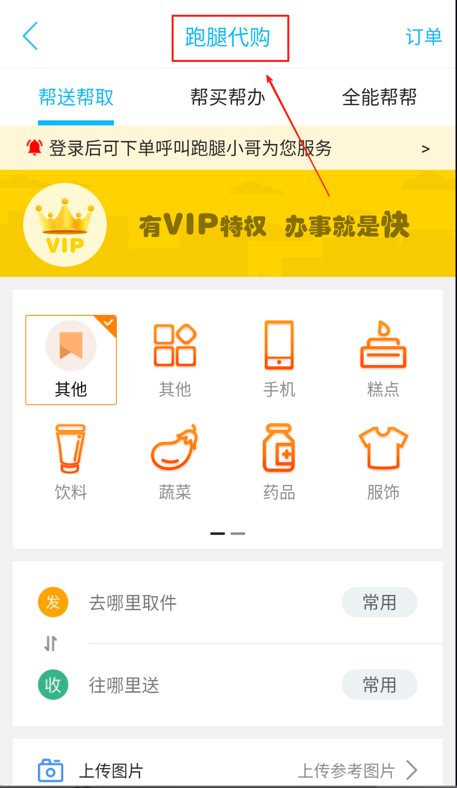 2、进入跑腿服务界面选择代购或代办类型,填写具体需求与地址信息后提交订单,系统将自动匹配附近骑手完成配送任务。