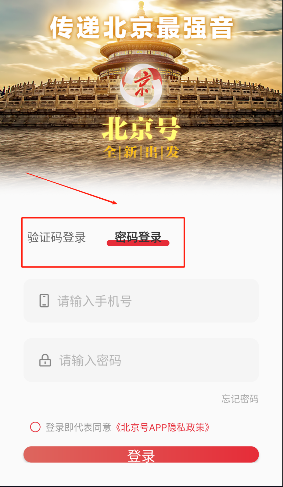 1、打开APP就能看到密码登录和验证码登录两种方式,选密码登录后输入手机号和对应密码,勾选同意隐私政策后点登录按钮就能进主页啦。