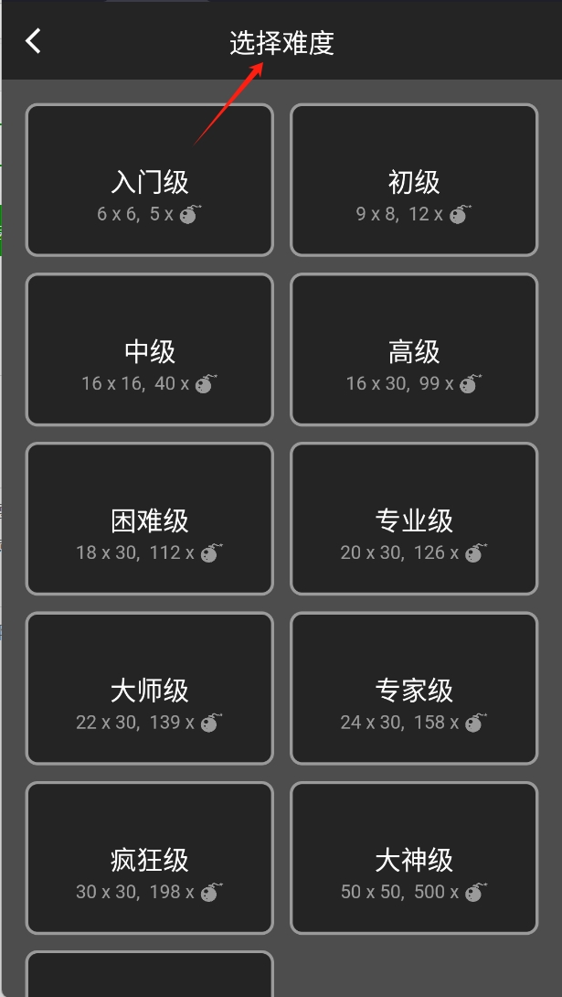 3、在“选择难度”界面,根据能力选择不同难度,挑战自我,提升扫雷技巧。