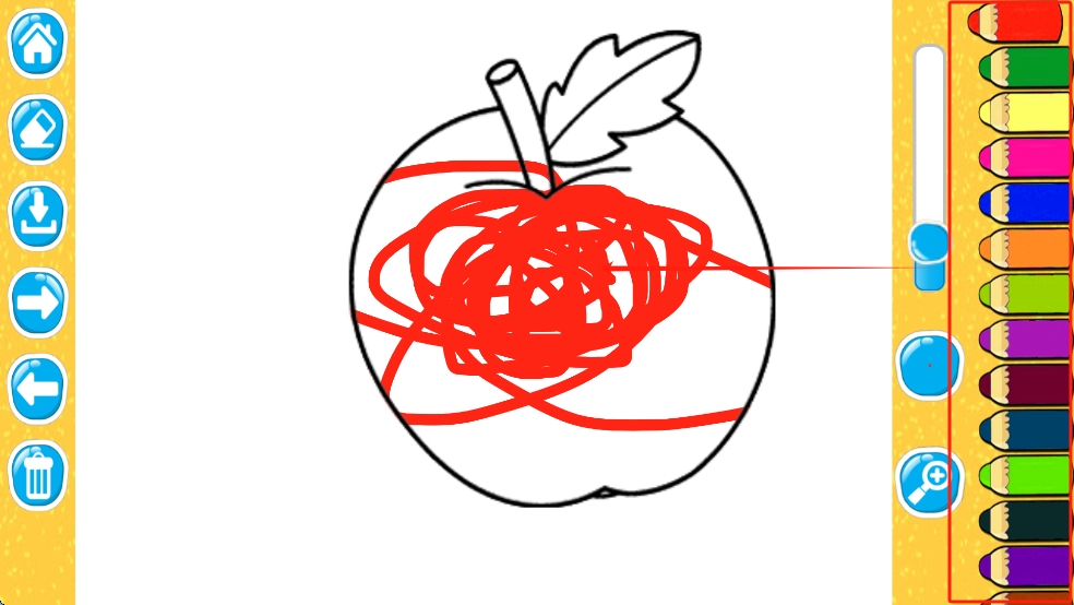 1、智能填色辅助:提供颜色提示功能,帮助幼儿认知水果真实颜色。也可以关闭提示,完全自由发挥。