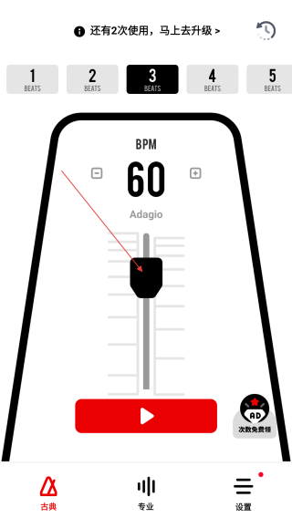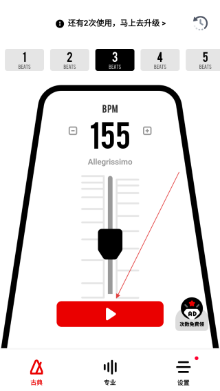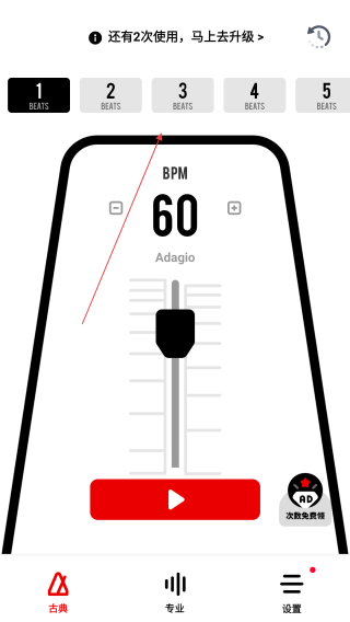 1、打开架子鼓节拍器,点击【箭头方向】。