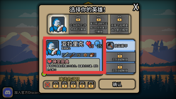1、在【选择你的英雄】界面中选择【亚拉里克】,其【神圣恩典】每击杀非精英敌人回复1点生命,为战斗提供续航。