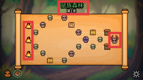 2、进入【鼠族森林第1关】,注意地图上标记的补给区域(如火焰处)与怪物位置,规划好行进路线。