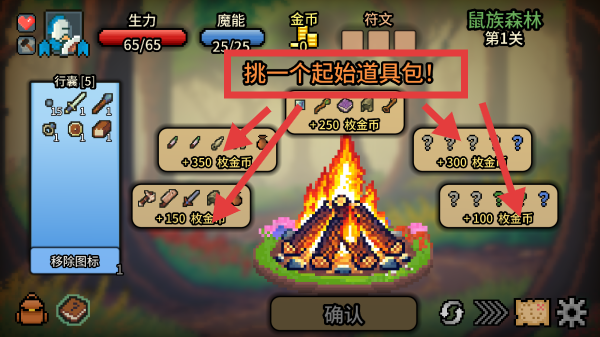 3、面对【挑一个起始道具包!】的提示,根据需求选择道具包(如优先获取金币可选择高金币奖励的包),增强初始资源。