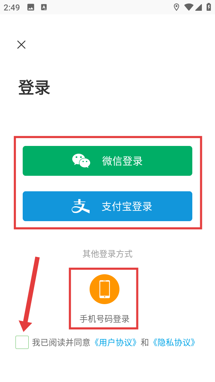 2、用户在登录界面里,先点击【已阅读并同意】后再自行选择方框内登录方式即可。