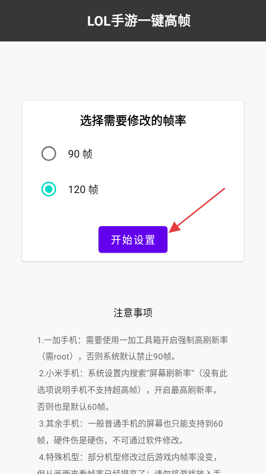 3、选择【120帧】后,点击【开始设置】应用帧率设置。