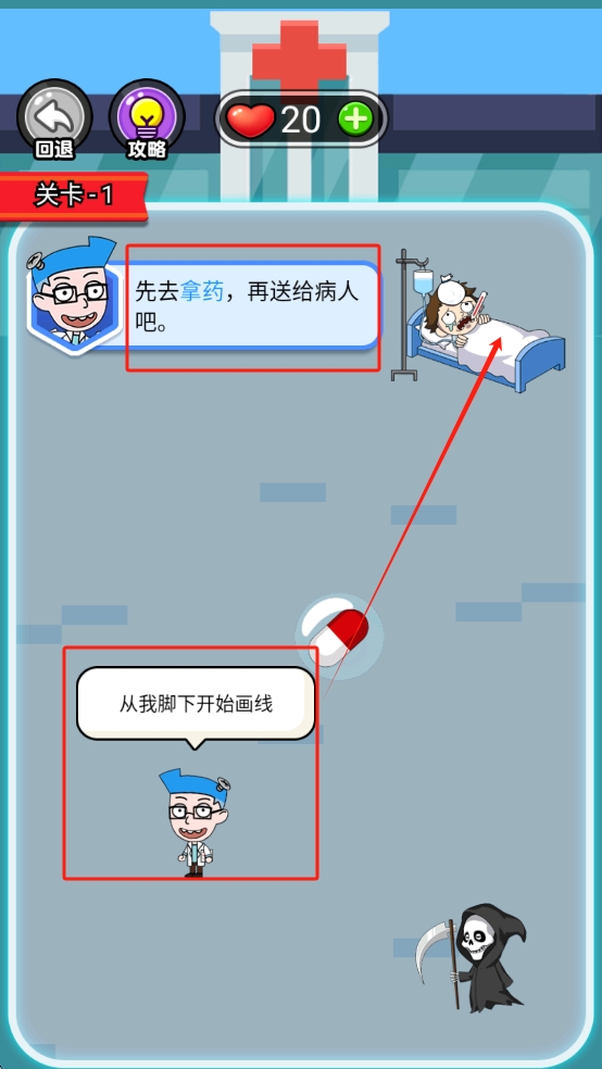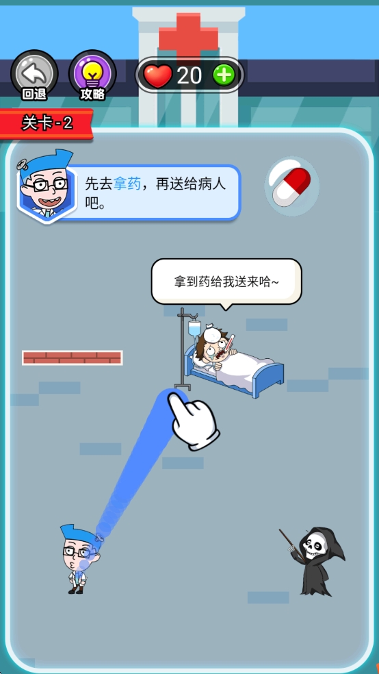 1、了解游戏任务。在游戏关卡界面,用户应阅读任务提示,了解当前关卡的目标,例如“先去拿药,再送给病人吧”。