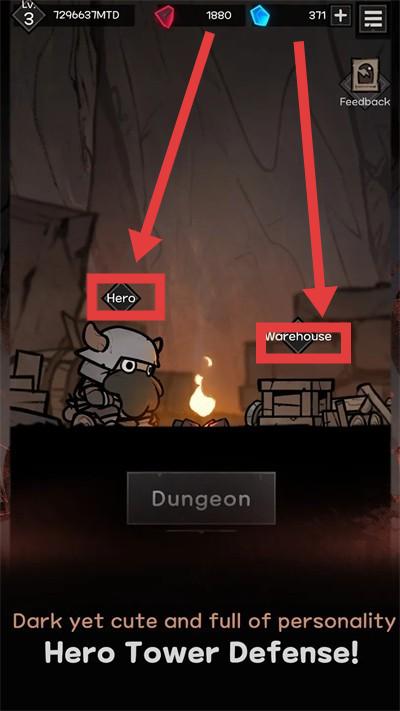 1、点击界面中的【Hero】可查看英雄相关信息,点击【Warehouse】可进入仓库管理界面。