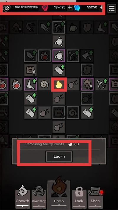 2、在技能界面中,点击【Learn】按钮,使用剩余能力点数学习技能提升实力。