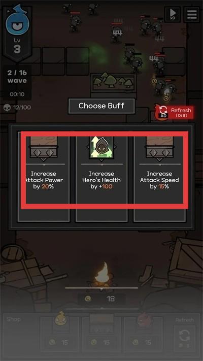 3、在【ChooseBuff】界面,根据战斗需求选择增益效果,如增加攻击力、英雄生命值或攻击速度。