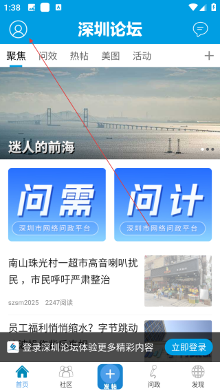 1、打开深圳论坛,点击【左上角】。