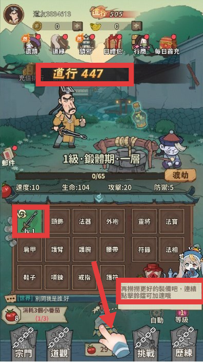 2、获得装备后点击【裝備】穿上新装备提升道行。