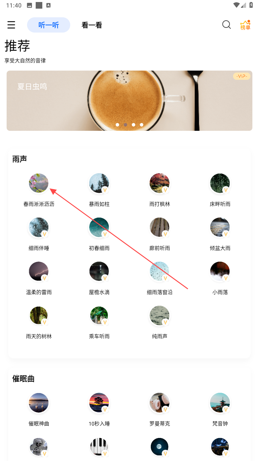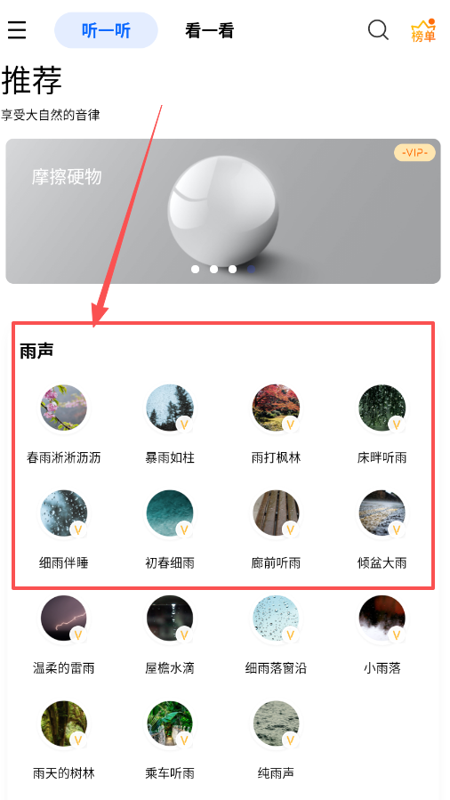 2、如果想找热门内容,就点“榜单”进入热播榜,看看“莫扎特摇篮曲”或“春雨淅淅沥沥”这些高播放量的选项。