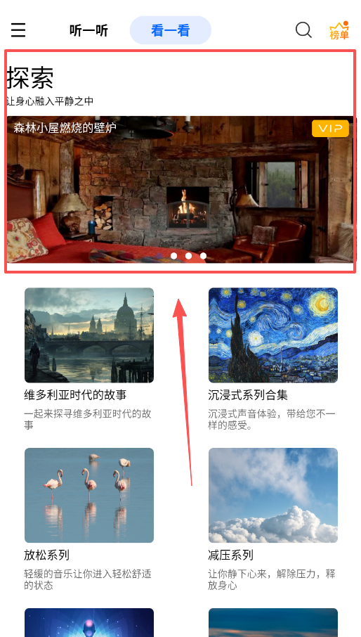 3、在“听一听”或“看一看”板块里,有“放松系列”“减压系列”等分类,融入平静氛围。
