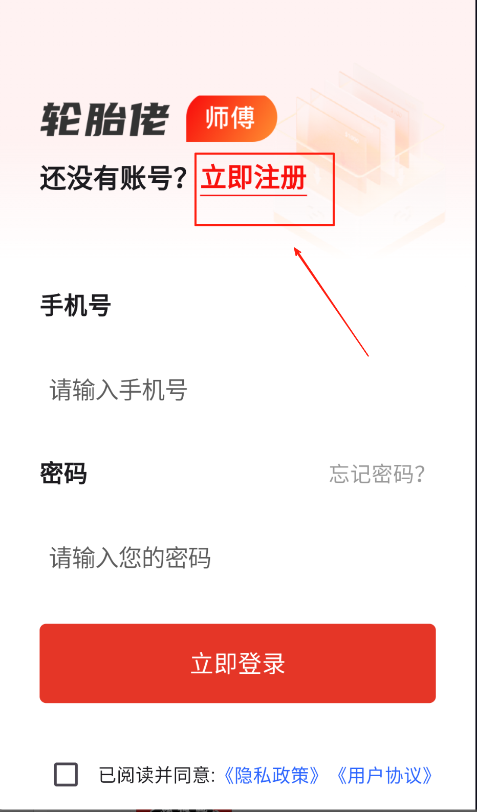 3、登录页面点“立即注册”就能开户,输完手机号和密码记得勾选协议,红色登录按钮挺显眼,点完就能进系统啦。