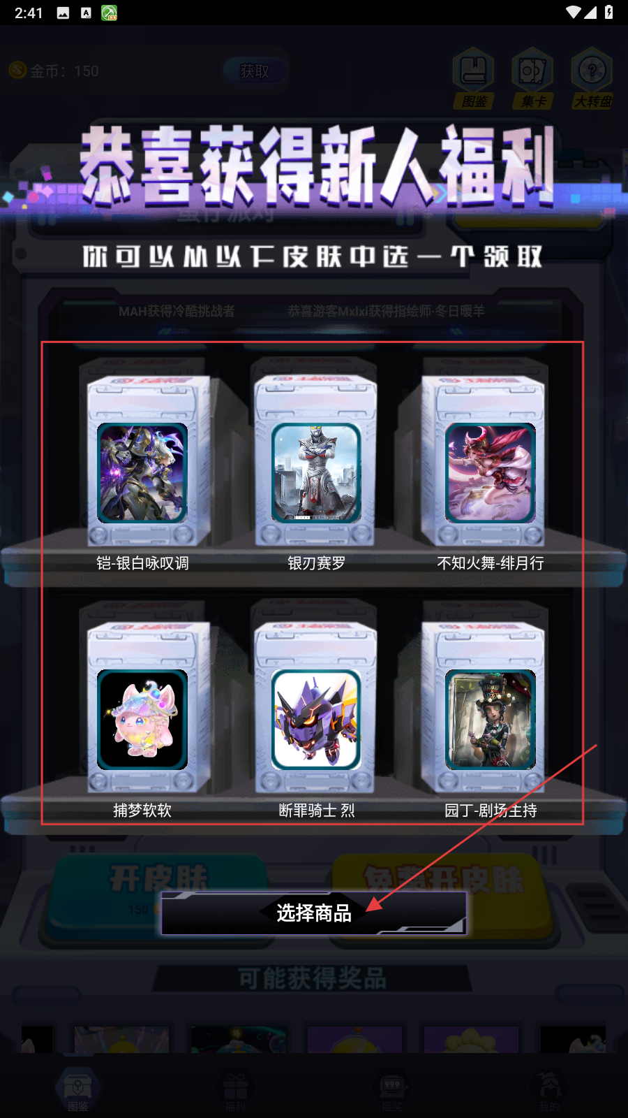 1、在新人福利界面,点击【选择商品】,从展示的皮肤中挑选一个领取。