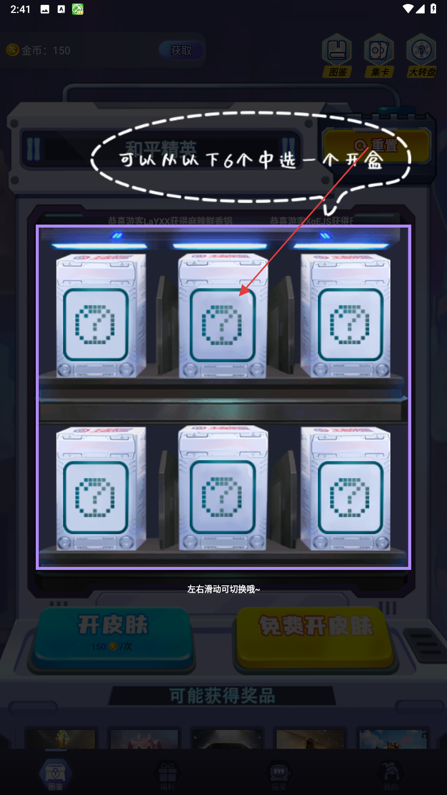2、在开盒界面,从6个盒子中选择一个点击开启,左右滑动可切换展示盒子。