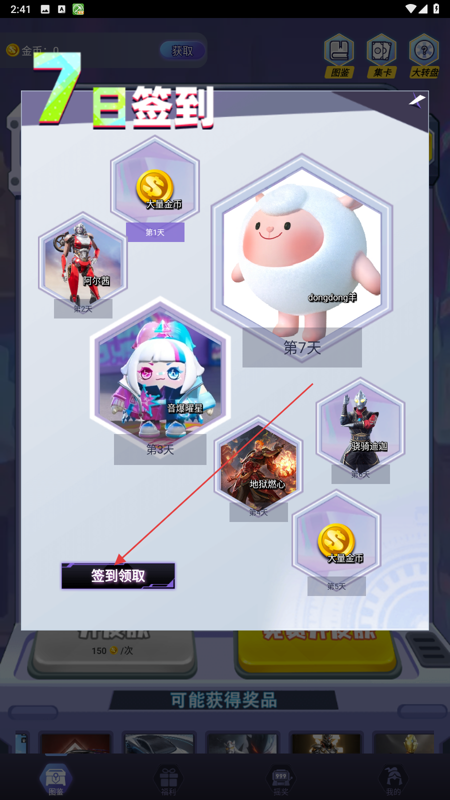 3、在7日签到界面,点击【签到领取】按天数获取对应奖励。
