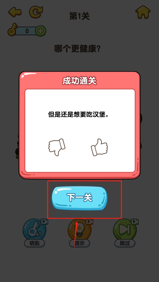 4、继续游戏:在成功回答问题后,点击“下一关”按钮继续进行游戏。