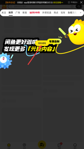 1、打开闲鱼,出现【温馨提示】界面后,点击【同意】按钮,接受隐私政策,才能进入应用主界面。