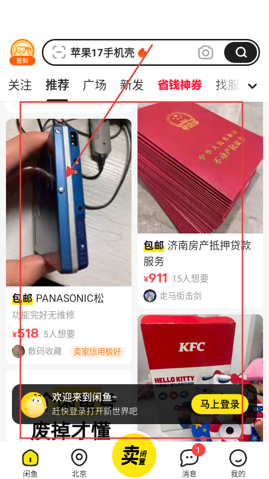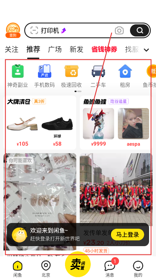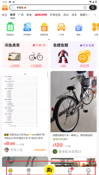 2、进入闲鱼主页,能看到各种分类入口和推荐商品,可根据需求浏览或搜索想要的商品哦。