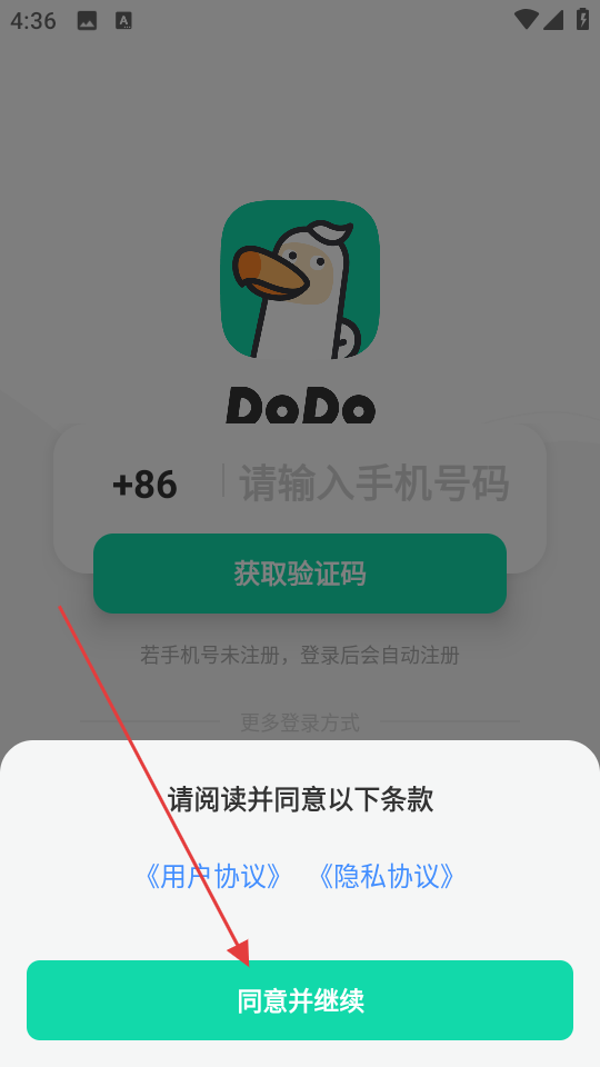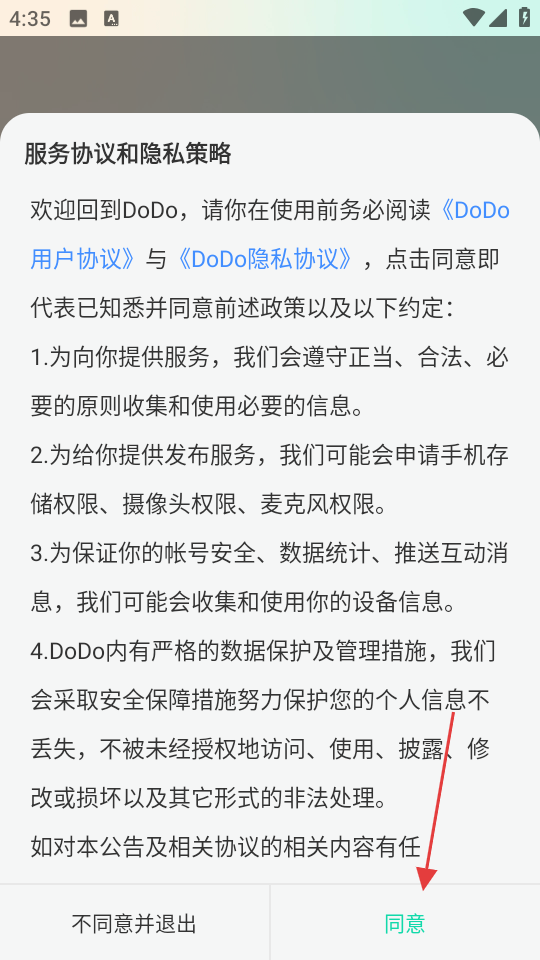 1、打开DoDo应用,点击【同意】接受服务协议和隐私策略。