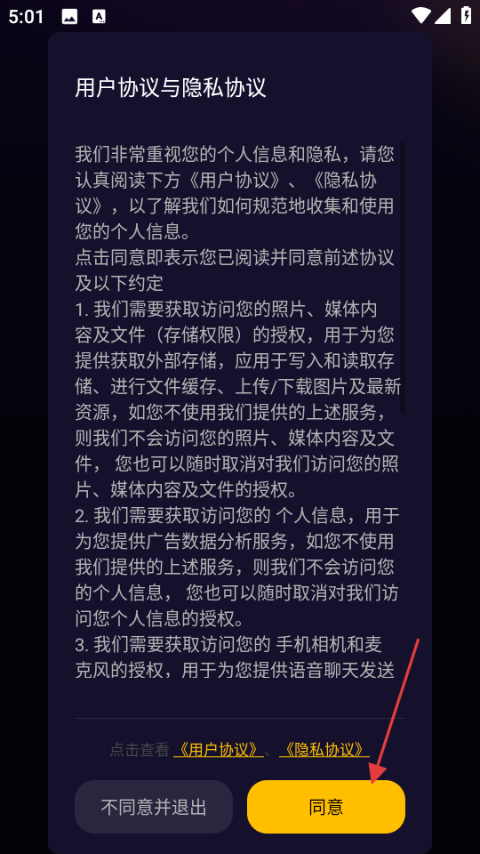 1、打开APP,点击【同意】接受用户协议与隐私协议。