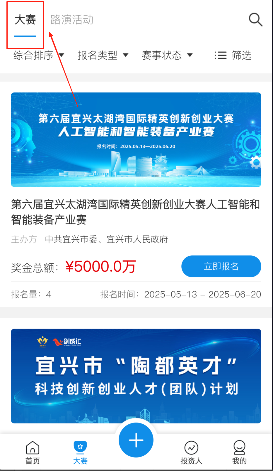 1、赛事板块集中展示全国创新创业赛事信息,通过活动时间筛选和奖励机制说明辅助决策,点击报名按钮即可提交项目材料。