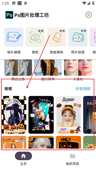 3、回到首页后,点【相框】板块里的样式,可给图片添加装饰性相框,让照片更有风格呀。