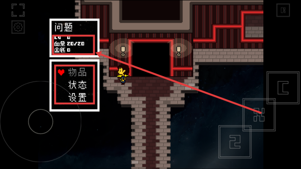 3、关注屏幕界面信息,如栏中显示的等级、血量、金钱,以及【物品】【状态】【设置】等功能选项,熟悉角色状态和游戏设置入口。