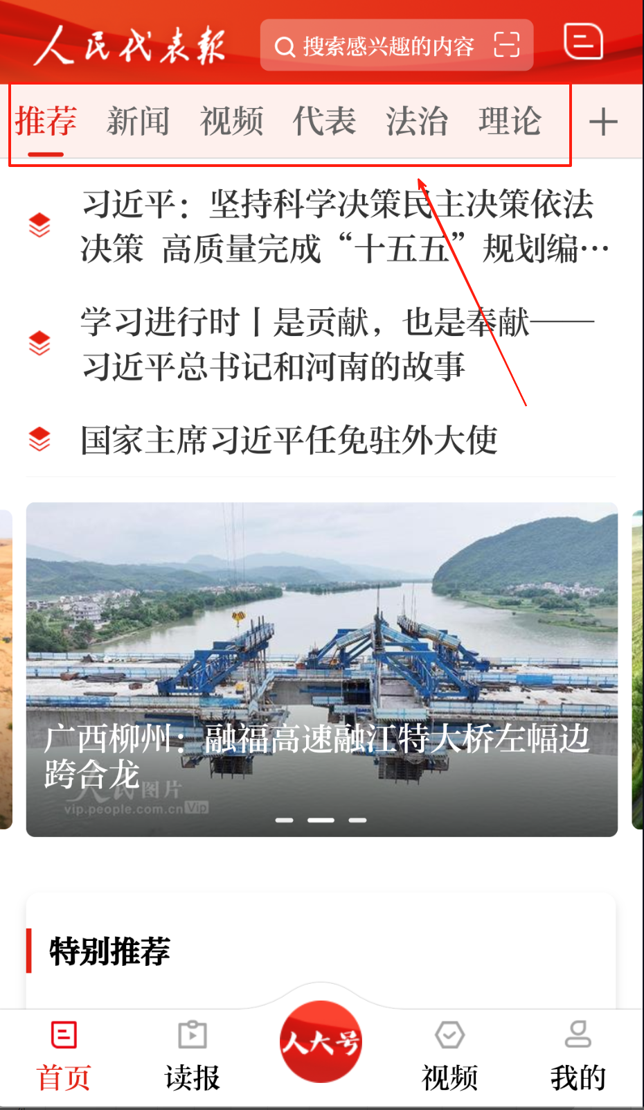 1、主界面按频道划分推荐内容,通过左右滑动切换视频报道与图文快讯,点击顶部"读报"按钮可调取当日电子版报纸。
