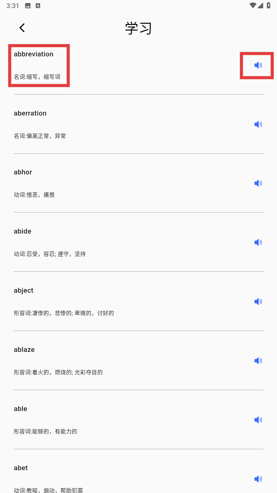 2、进入【学习】页面后,可查看单词如【abbreviation】,其词性为名词,释义是【缩写,缩写词】,点击单词旁喇叭图标可听发音辅助学习。