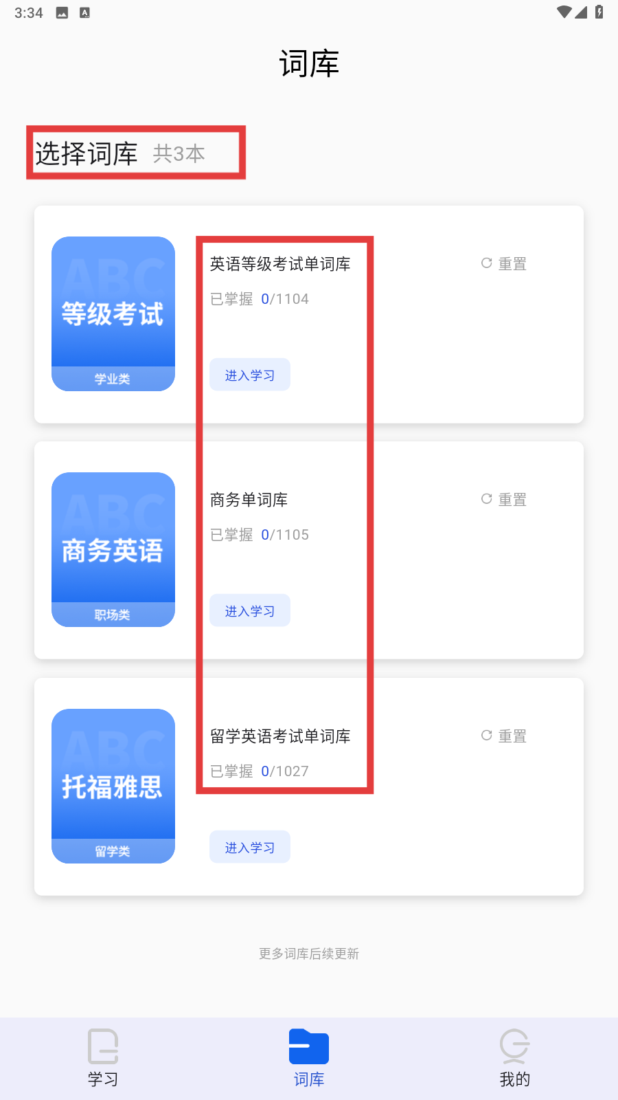 3、在【词库】页面,可通过选择【英语等级考试单词库】【商务单词库】【留学英语考试单词库】等,查看已掌握进度后点击【进入学习】。