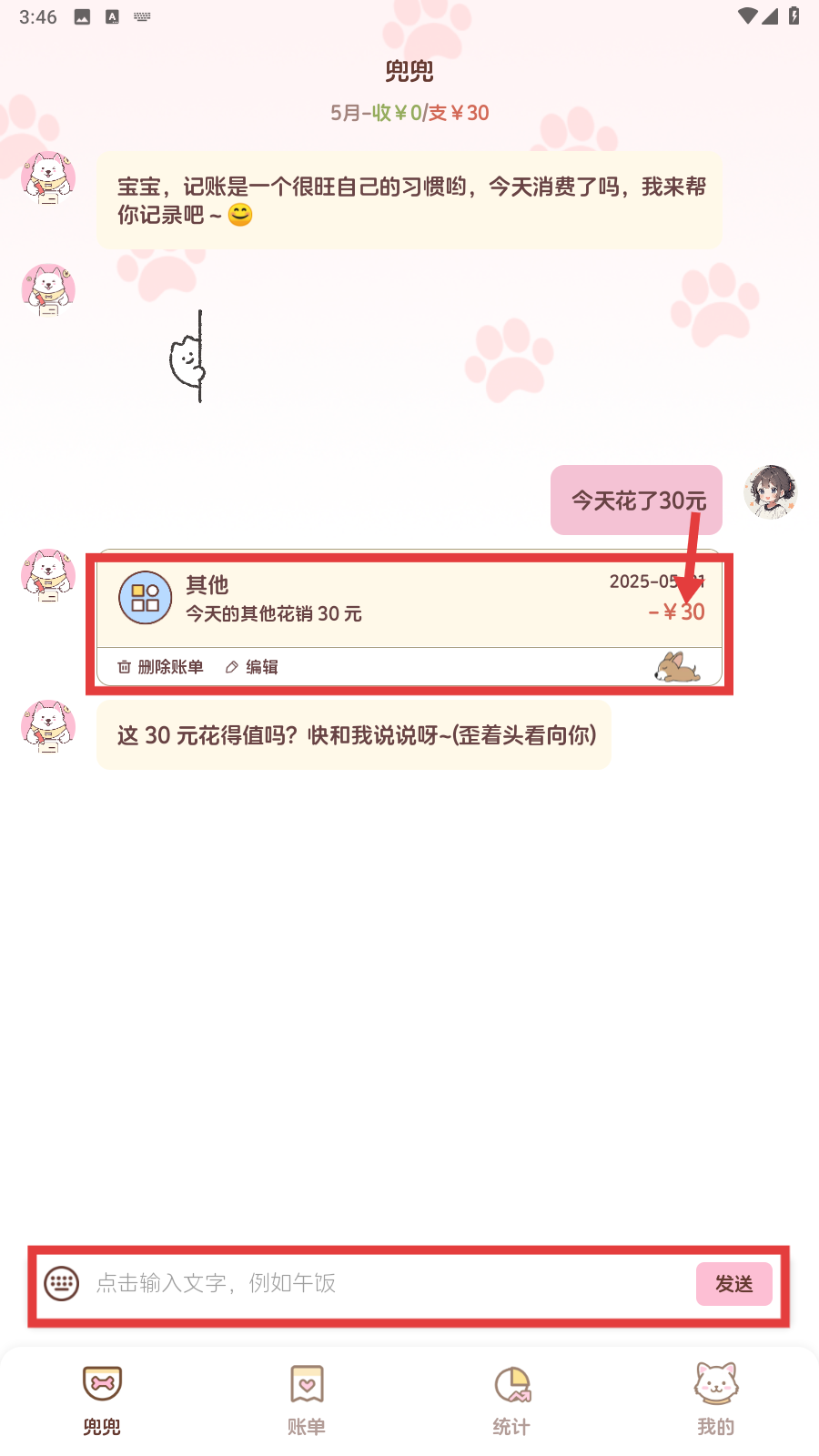 1、打开【阿兜记账】应用,在聊天框,输入消费金额及事项,如【今天花了30元】,发送后系统自动记录为【其他】类别支出。
