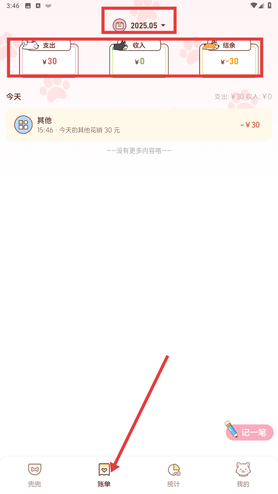 2、点击底部【账单】按钮,可查看当月【2025.05】的【支出】【收入】【结余】情况,清晰掌握财务数据。