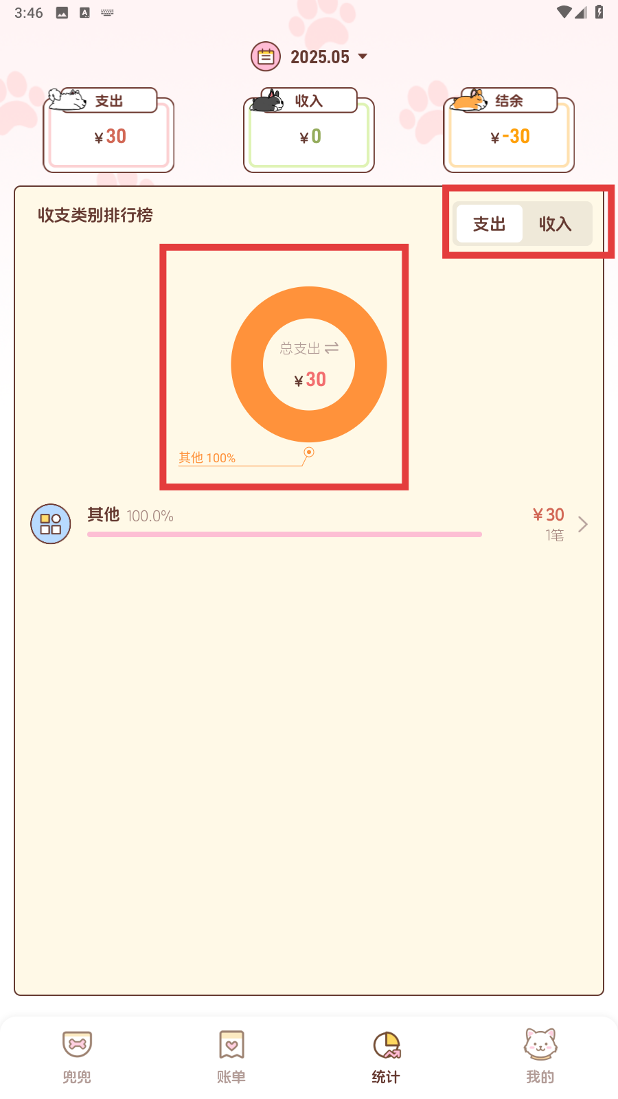 3、在【账单】页面,通过切换【支出】【收入】选项,查看【收支类别排行榜】,如环形图展示的总支出情况,了解消费占比。