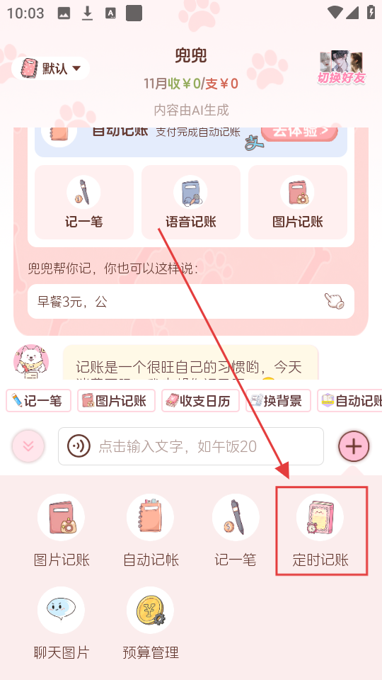 2、展开功能选项后,点击【定时记账】,可进入定时记账页面哦。