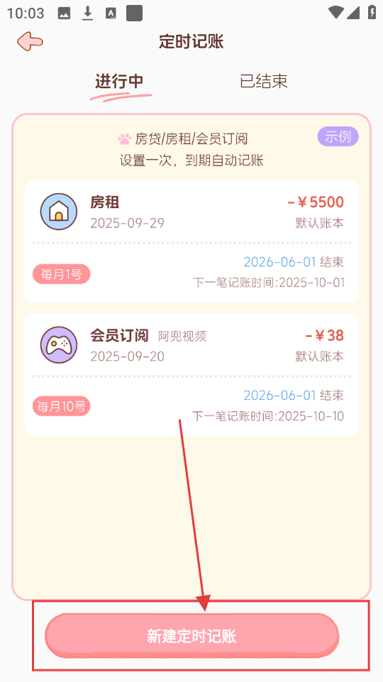 3、进入定时记账页面后,点击【新建定时记账】,可开始设置新的定时记账任务啦。